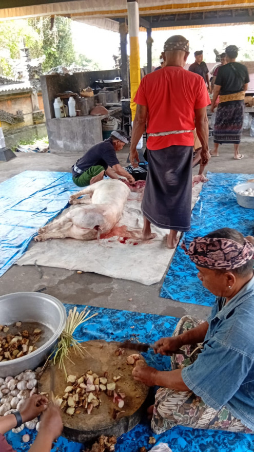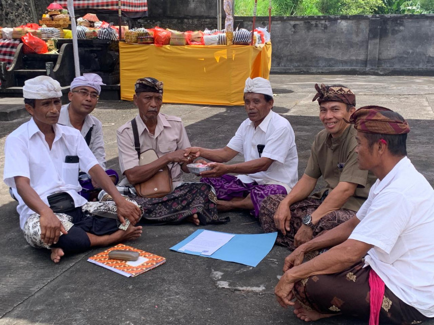 Penyerahan punia piodalan Pura Kayangan Tiga Pura Puseh dan Pura Dalem Desa Satra.